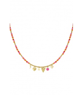 Oranje met roze halsketting met verschillende soorten hangers De lengte van de halsketting is circa 38 cm. De ketting heeft een verlengkettinkje van 5 cm