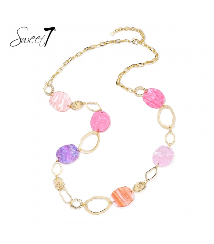 Zin in een sieraad dat meteen de toon zet? Deze halsketting van Sweet7 is een explosie van kleur en stijl. De mix van marmerlook schijven in roze, paars, oranje en lila geeft een speels en eigentijds effect. Goudkleurige open schakels zorgen voor balans en een luxe afwerking. Een ketting voor wie durft en kleur omarmt.