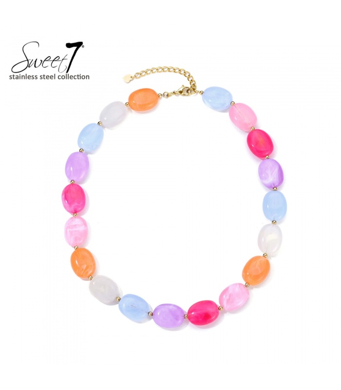 Hoe voeg je kleur toe zonder in te boeten op stijl? Deze halsketting doet het moeiteloos. De gladde kralen in pastel en felle tinten zorgen voor een levendige uitstraling die direct de aandacht trekt. Subtiele goudkleurige details geven het geheel een verfijnde afwerking.
