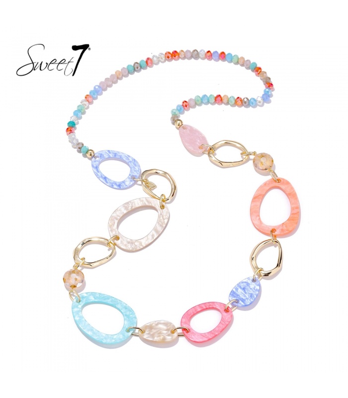Hoe geef je elke outfit een frisse en speelse touch? Deze halsketting van Sweet7 doet het moeiteloos. De combinatie van kleurrijke facetkralen en organisch gevormde schakels in pastel tinten geeft een vrolijke, maar elegante uitstraling. De mix van lichtblauw, zachtroze, parelmoer en goud zorgt voor een zomerse uitstraling die je het hele jaar door kunt dragen. Een must have voor fashion liefhebbers die houden van kleur en klasse.