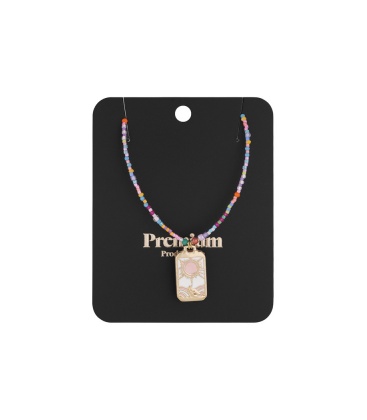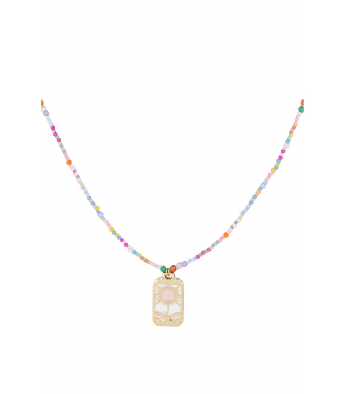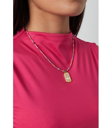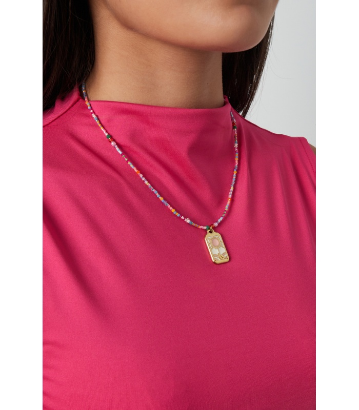Deze halsketting combineert levendige kralen met een stijlvolle hanger, waardoor het een opvallend sieraad is dat elke outfit verrijkt. De kleurrijke kralen voegen een speelse touch toe, terwijl de hanger zorgt voor een elegante uitstraling.