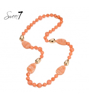 Ketting met koraalrode kralen en goudkleurige accenten. De ketting is lichtgewicht en geschikt voor zowel casual als chique gelegenheden. De combinatie van warme tinten en glanzende elementen maakt dit sieraad een opvallend mode-item.