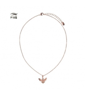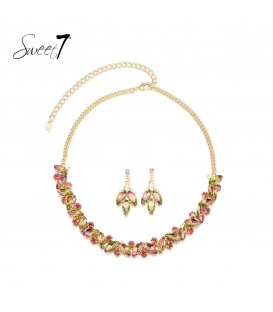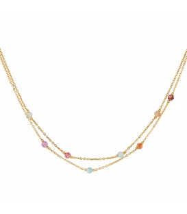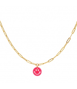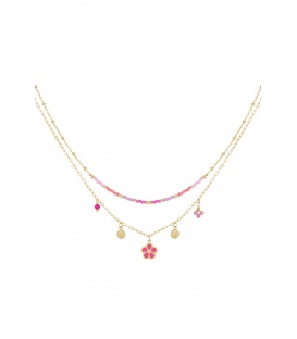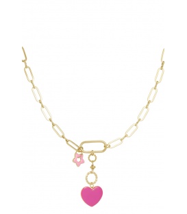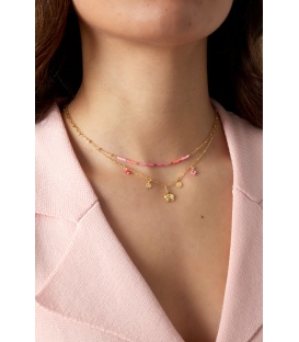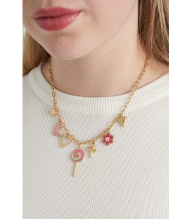 Goudkleurige halsketting met verschillende bedels in de kleur roze. De lengte van de halsketting is circa 41 cm. De ketting heeft een verlengkettinkje van 5 cm