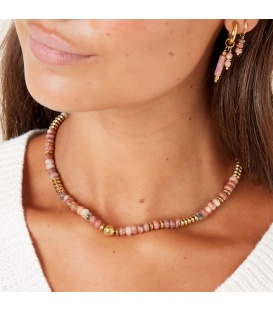 Roze korte halsketting met goudkleurige elementen. De lengte van de halsketting is circa 40 a 42 cm. De ketting heeft een verlengkettinkje van 5 cm.