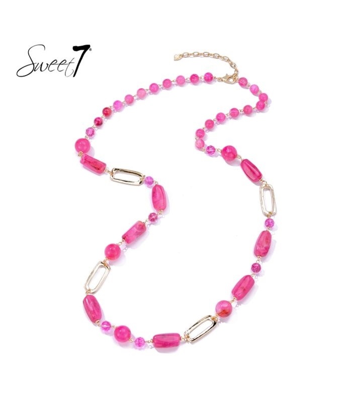 Deze halsketting geeft direct power aan je look. De roze kralen ketting combineert glanzende kralen met goudkleurige schakels voor een speels contrast. Perfect als statement ketting bij een basic outfit of zomerse jurk.