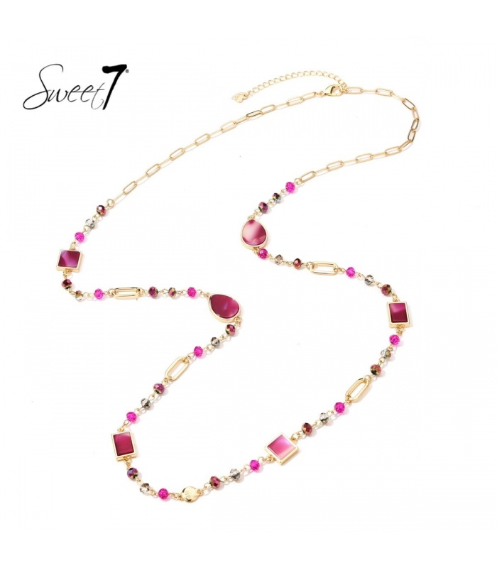 Zoek je een opvallend accessoire dat elegantie en speelsheid combineert? Deze halsketting van Sweet7 springt direct in het oog dankzij de mix van fuchsia kralen, geometrische vormen en goudkleurige schakels. Perfect voor wie houdt van kleurrijke sieraden met een luxe twist. Combineer met een basic top en je look krijgt meteen flair.