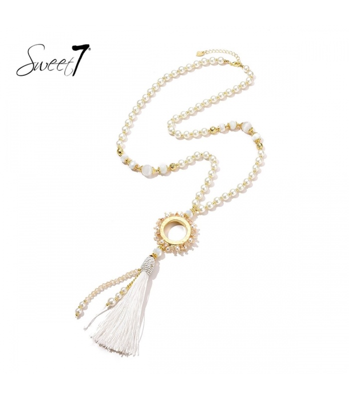 Witte lange halsketting met imitatie parels en een kwast als hanger.