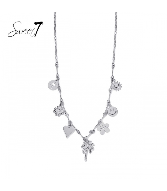 Halsketting met bedels is een must-have voor elke fashionista. Deze zilverkleurige ketting combineert verschillende bedels zoals hartjes, palmbomen smiley voor een speelse en elegante look. Gemaakt van roestvrij staal, is deze ketting duurzaam en nikkelvrij. De verstelbare lengte zorgt voor een perfecte pasvorm bij elke outfit.