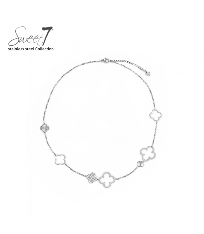 Hoe geef je elke outfit een subtiele, stijlvolle upgrade? Deze halsketting van roestvrij staal combineert minimalistische elegantie met speelse vormen. De afwisseling van opengewerkte en gezette klavervormige elementen zorgt voor een luchtige, luxueuze uitstraling. Perfect voor dagelijks gebruik of een chique avondlook.