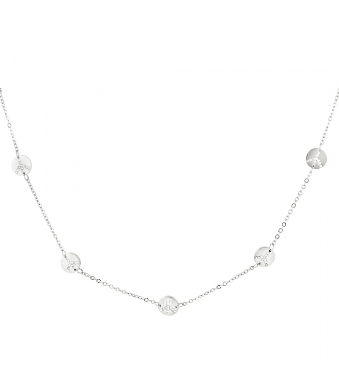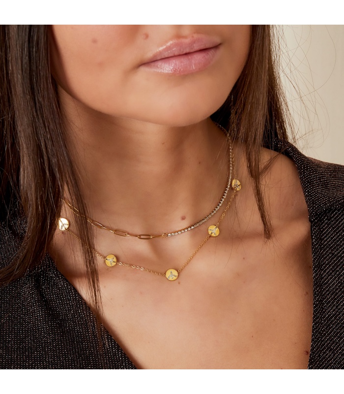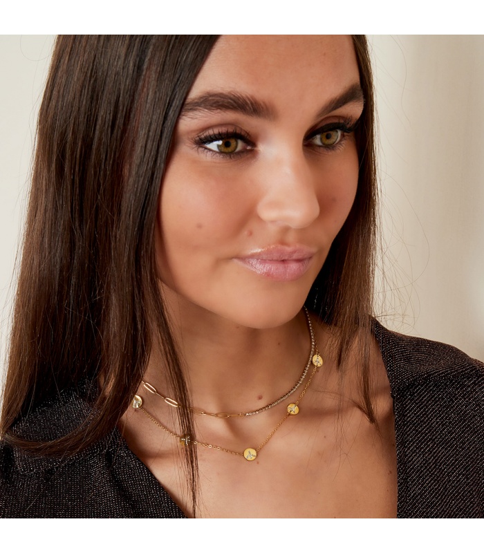 Goudkleurige halsketting met rondjes en steentjes.