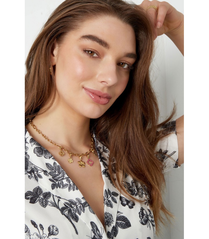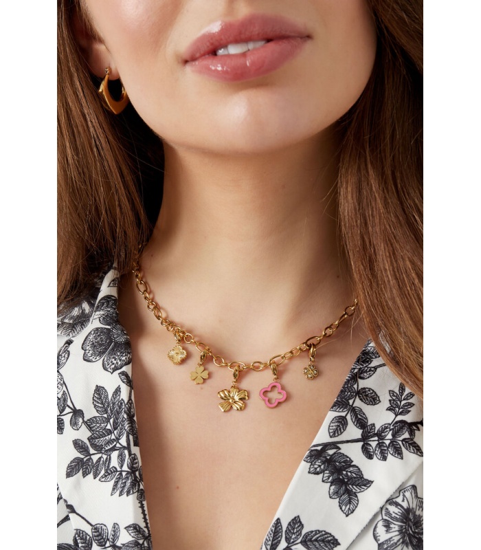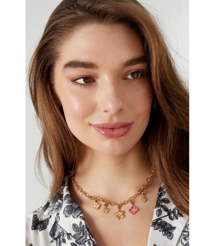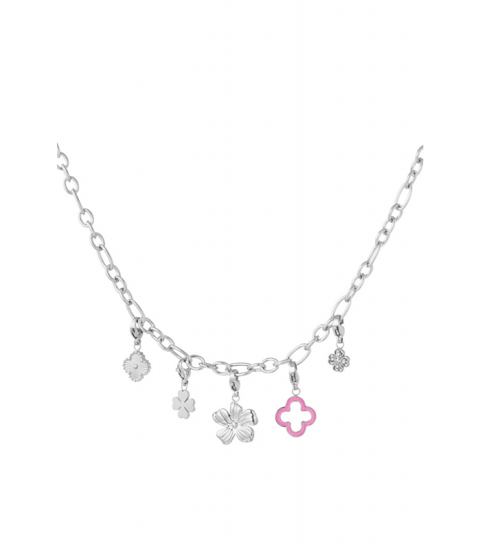 De charme van onze zilverkleurige halsketting, verrijkt met delicate bloemen bedels. Een perfecte harmonie van klassieke elegantie en moderne finesse, ontworpen voor de fashion-forward vrouw. Deze ketting is het summum van verfijning, en brengt een vleugje natuurlijke schoonheid dichter bij je hart.