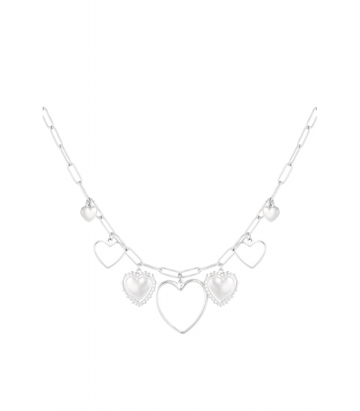 Deze zilverkleurige halsketting is versierd met meerdere hartvormige bedels, wat het een romantische en elegante uitstraling geeft. Het tijdloze ontwerp maakt het een veelzijdig accessoire dat zowel bij casual als formele outfits past. Hartvormige sieraden symboliseren liefde en genegenheid, waardoor ze perfect zijn om jezelf of een dierbare mee te verrassen.