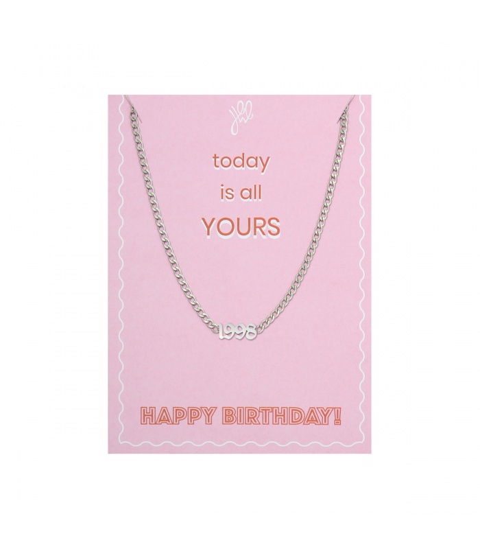 Zilverkleurige halsketting met geboortejaar 1998 en verjaardagskaart.