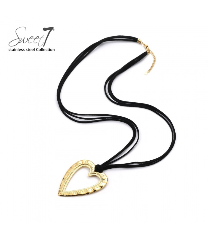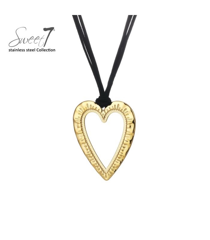 Hoe geef je een casual outfit direct karakter? Deze halsketting van Sweet7 combineert een opengewerkt hart in goudkleurig stainless steel met een zwart, koord. De asymmetrische hartvorm geeft een speelse twist, terwijl de textuur in het metaal zorgt voor een eigentijdse uitstraling. Minimalistisch, maar met impact.