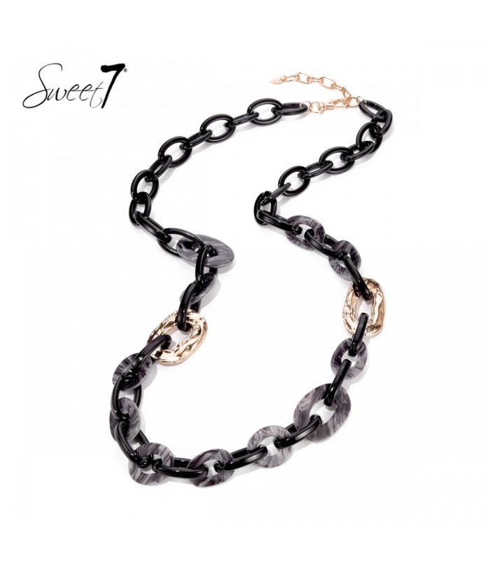 Wil je jouw outfit net dat beetje extra geven? Deze halsketting van Sweet7 combineert glanzende zwarte schakels met gemarmerde grijstinten en opvallende goudkleurige details. Het resultaat is een krachtige, maar vrouwelijke look die direct in het oog springt.