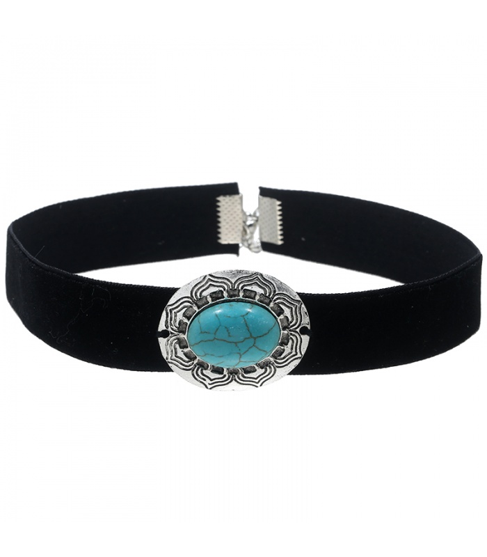 Zwarte trendy fluweel choker met blauwe turquoise steen in zilverkleurige zetting.
