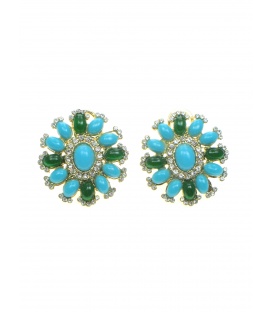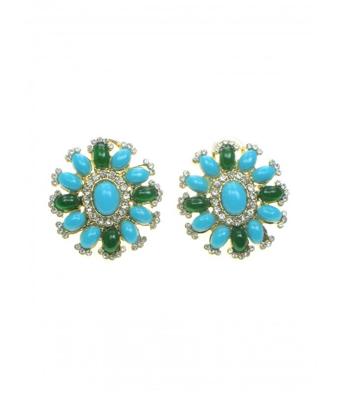 Ronde blauw met groene oorbellen in goudkleurige zetting.