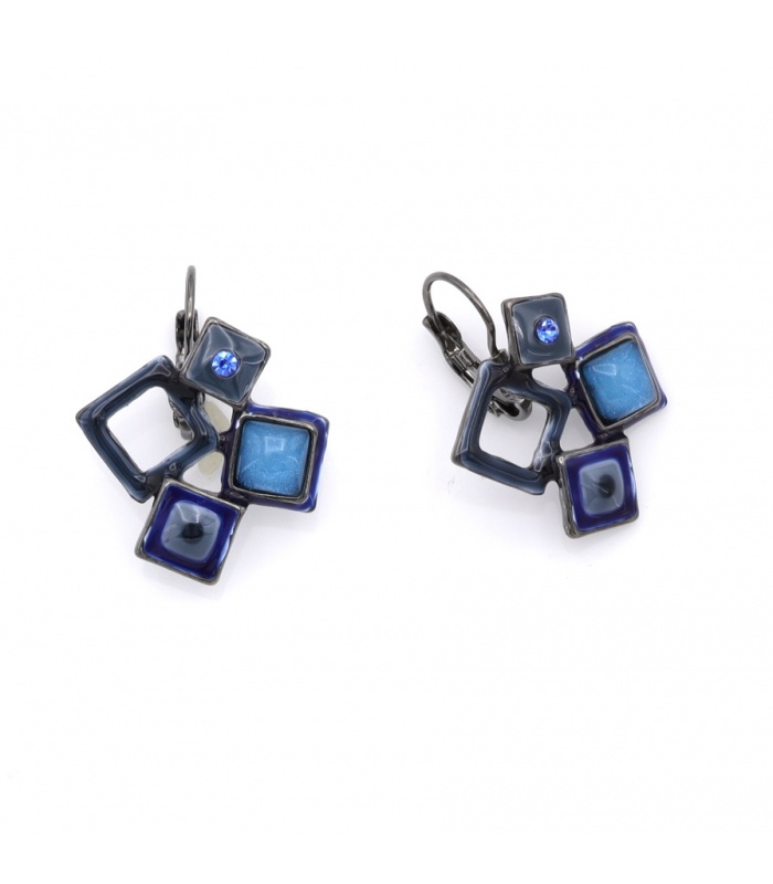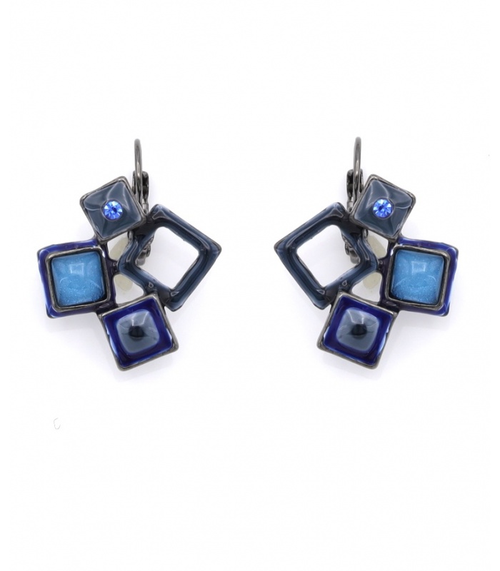 De unieke compositie van vierkante elementen in diepblauw en kobalttinten geeft deze oorbellen een moderne en speelse uitstraling. De glans van het emaille en de subtiele schittering van de blauwe steen zorgen voor een kunstzinnig geheel.