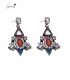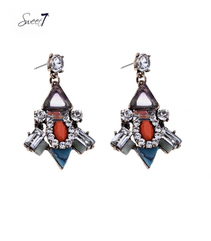 Blauwe oorbellen met strass stenen en oranje steen midden in de hanger.