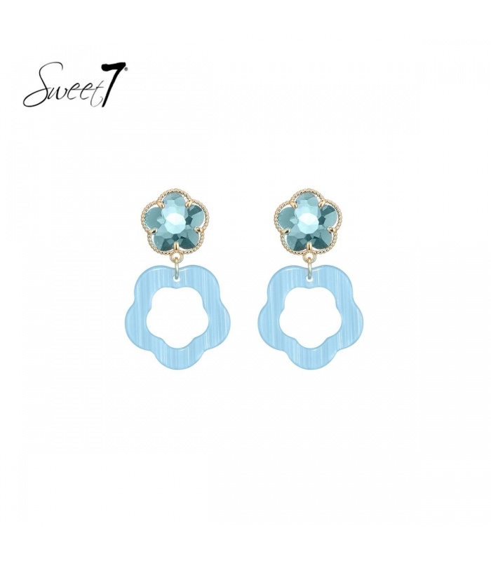 Blauwe oorhangers in de vorm van een bloem.