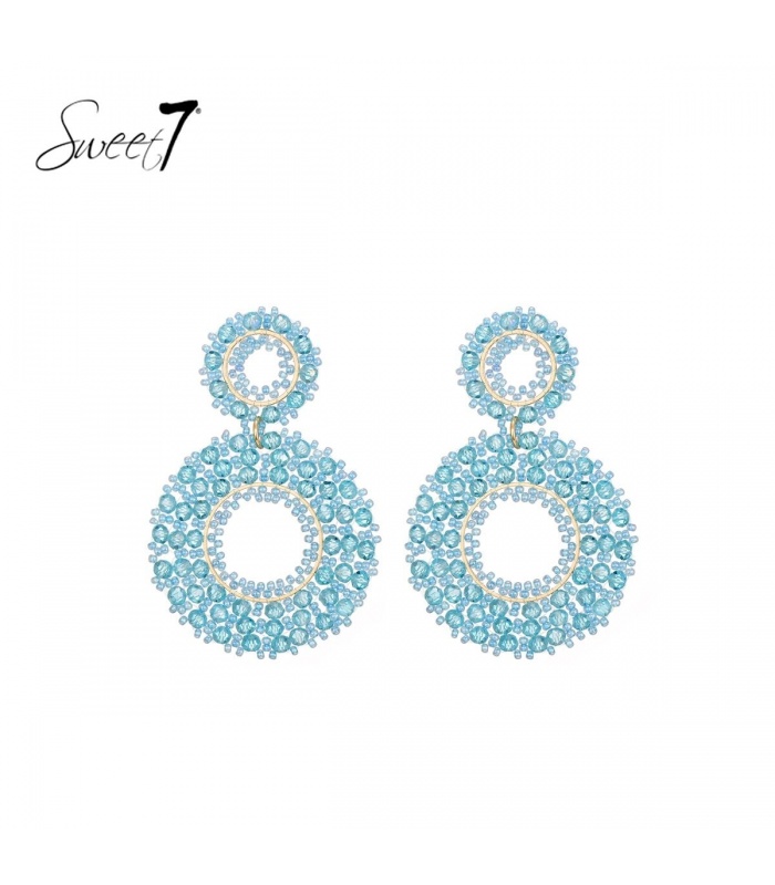 Onze adembenemende blauwe oorhangers, verrijkt met meerdere rijen glas kralen. De blauwe kleur en het sprankelende design voegen een vleugje glamour toe aan elke outfit.