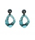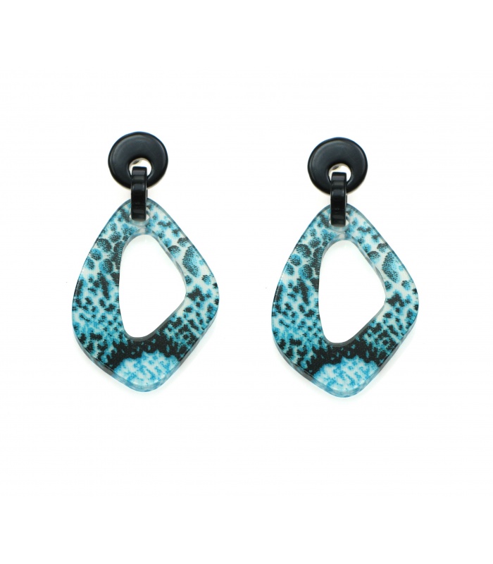 Driehoekige blauw groene oorbellen met dierenprint hanger en zwarte oorsteker.