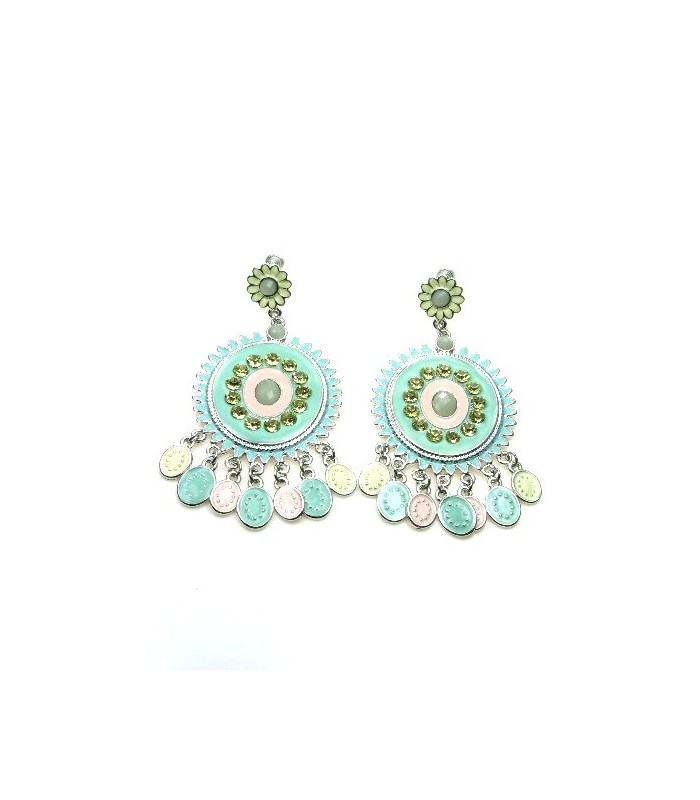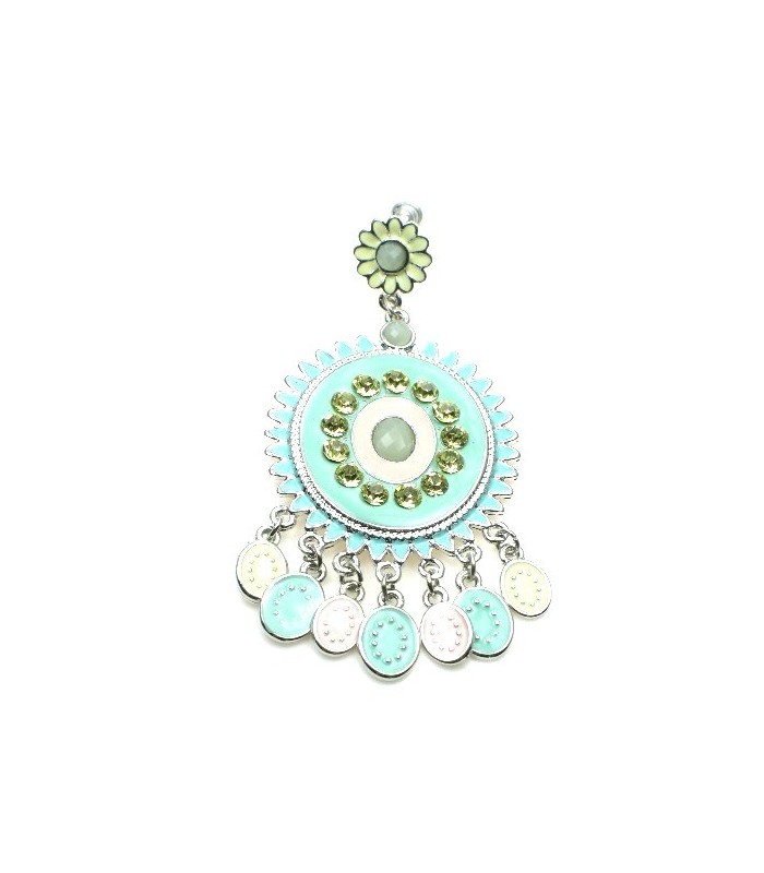 Oorbellen met mintblauwe inkleuring en strass. Lengte van de oorbel is 7,5 cm.