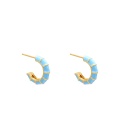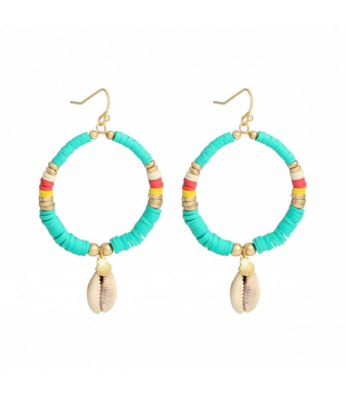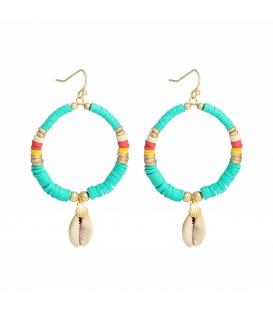 Oorbellen gemaakt van kleine turqouise ringetjes en schelpen bedel