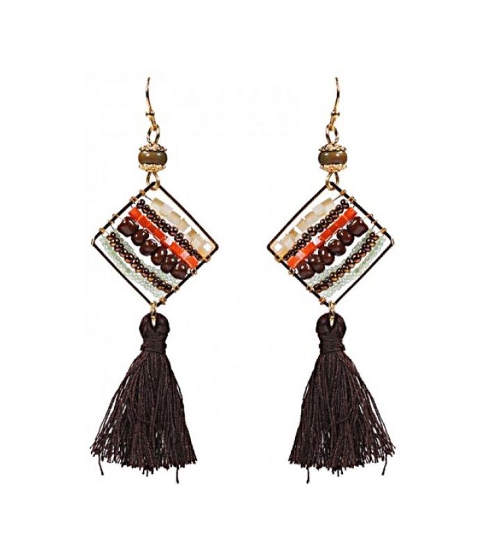 Bruine oorbellen met kwast en kleine kraaltjes.
