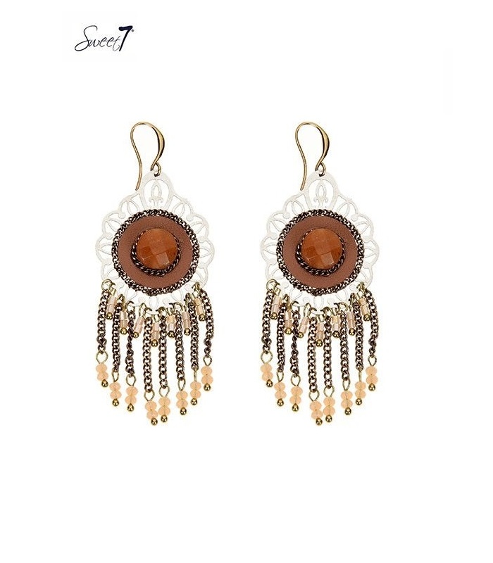 Bruin gekleurde oorhangers met metalen strengen en kraaltjes.