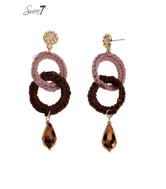 Bruin met roze oorhangers de cirkels zijn bewerkt met draad en kraal.