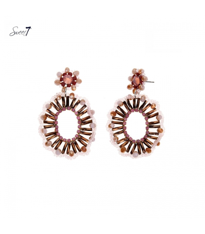 Bruine oorhangers met staafjes en roze kraaltjes .