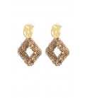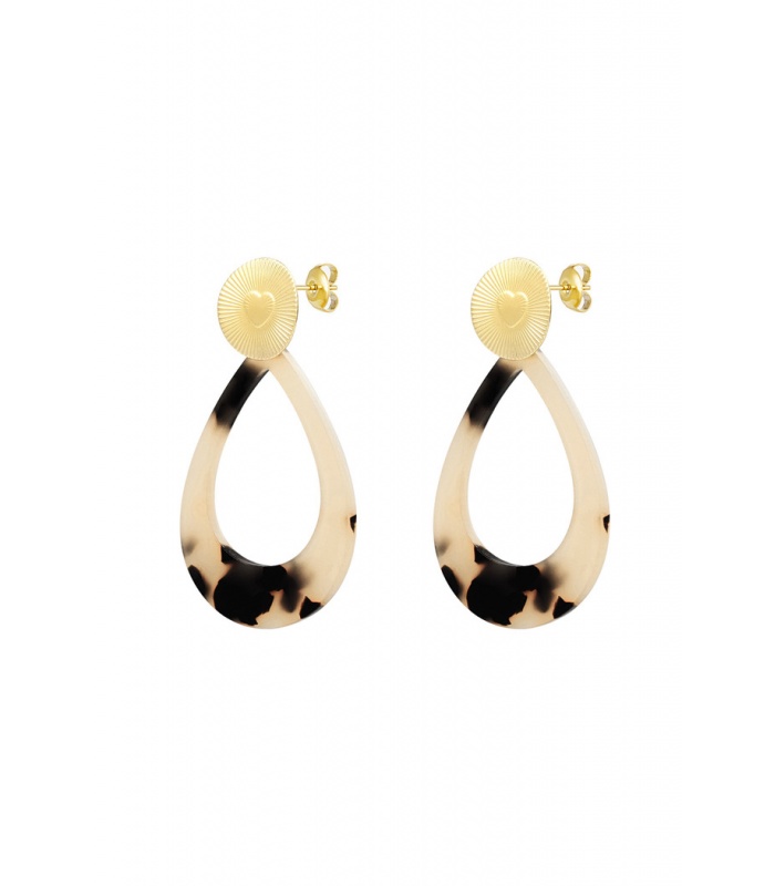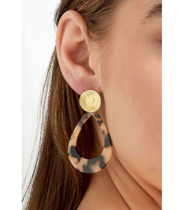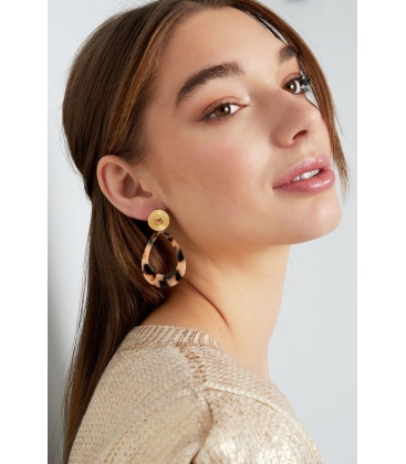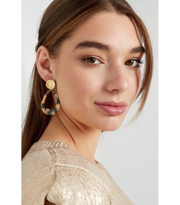 Beige gekleurde oorhangers met een goudkleurig bewerkt oor stukje