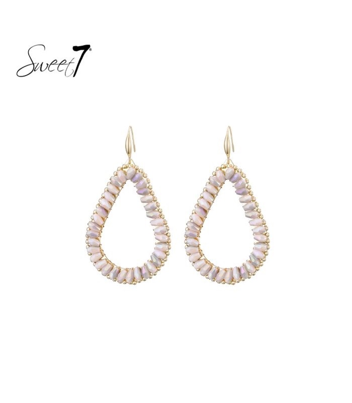 Deze oorbel met beige kralen en goudkleurige rand geeft een zachte maar luxe uitstraling. De druppelvormige oorbellen passen perfect bij elke outfit en zorgen voor een elegante, modieuze look.