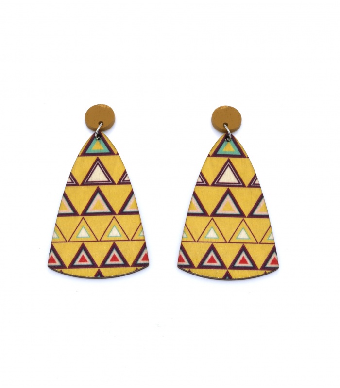Natuurlijke gele houten oorbellen met driehoek motief.