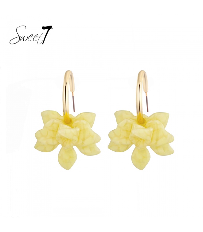 Met hun bloemvormige design in zachtgeel zijn deze oorbellen allesbehalve standaard. De moderne mix van een strakke gouden ring met een organisch gevormde bloemdecoratie geeft een frisse en opvallende look. Ideaal voor wie houdt van fashion statements met een twist.