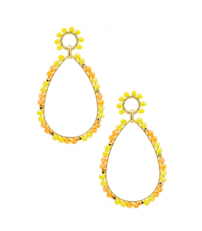 Voeg een stralende touch toe aan je look met deze prachtige goudkleurige oorhangers met gele en oranje kraaltjes. Deze oorhangers zijn voorzien van levendige gele en oranje kraaltjes, waardoor ze een opvallend en modieus accessoire zijn. Met deze oorhangers geef je je stijl een zonnige en vrolijke uitstraling.