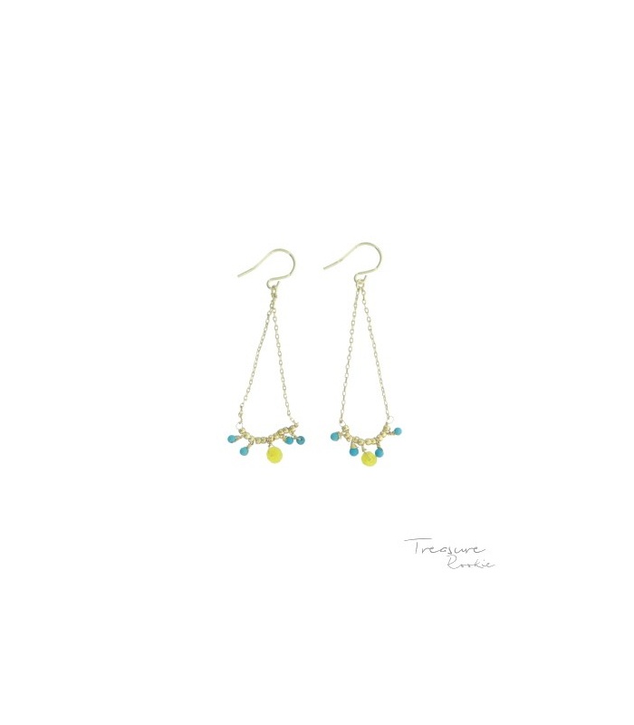 Goudkleurige oorbellen van metaal kettinkje en gekleurde kraaltjes.