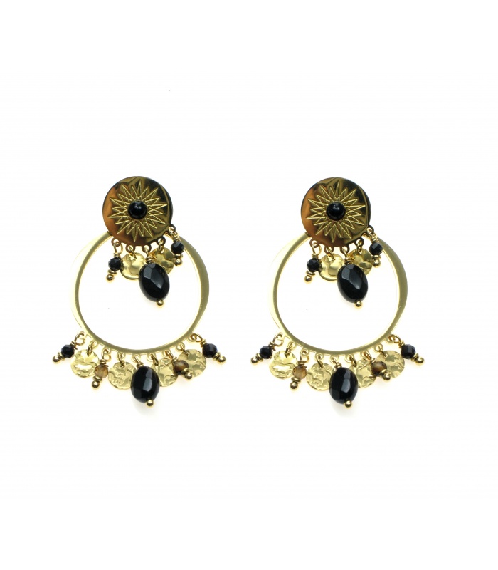 Goudkleurige oorhangers met bedels en zwarte kralen.