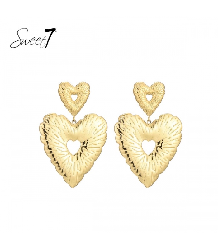 Op zoek naar oorbellen die glamour en speelsheid combineren? Deze goudkleurige hartoorbellen hebben een uniek gehamerd motief en een uitgesneden hartje in zowel steker als hanger. Perfect voor een opvallende, romantische look.