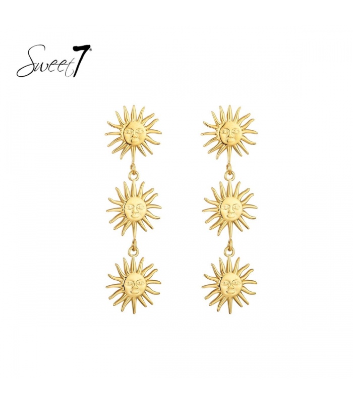 Deze goudkleurige oorbellen met drie zonvormige hangers stralen een unieke en elegante charme uit. Het ontwerp met meerdere zonnen symboliseert vitaliteit en energie, waardoor ze een opvallende toevoeging zijn aan elke outfit. Het goudkleurige materiaal geeft een luxe touch die moeiteloos te combineren is met andere sieraden