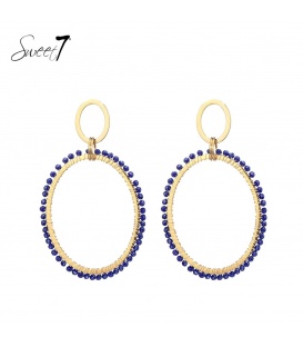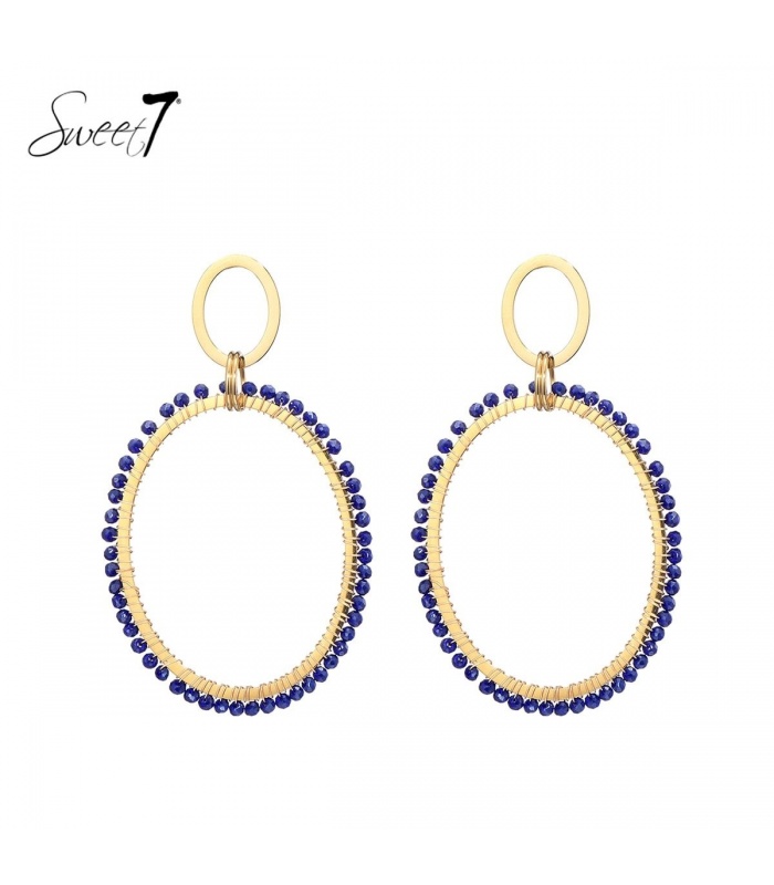 Goudkleurige oorhangers met blauwe kraaltjes.