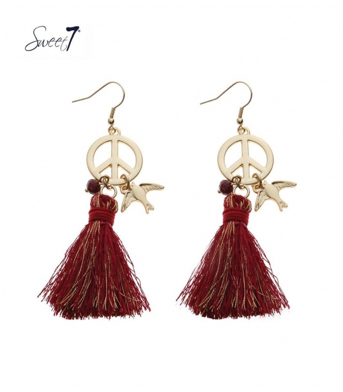 Goudkleurige oorhangers met een peace teken,vogel en een rode kwast.