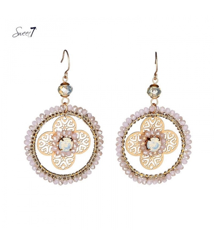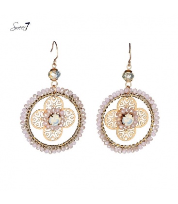 Goudkleurige oorhangers met in de hanger een bloemvorm en roze kraaltjes