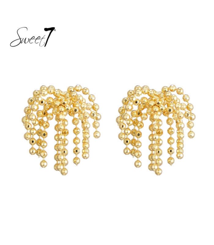 Hoe geef je een simpele outfit in een keer een glam boost? Met deze opvallende oorbellen van Sweet7. De gouden kralen vallen in speelse strengen naar beneden en vangen elk lichtstraaltje. Perfect voor feestjes, diners of een avondje uit. Statement oorbellen zoals deze combineren moeiteloos met zowel casual als chique looks.