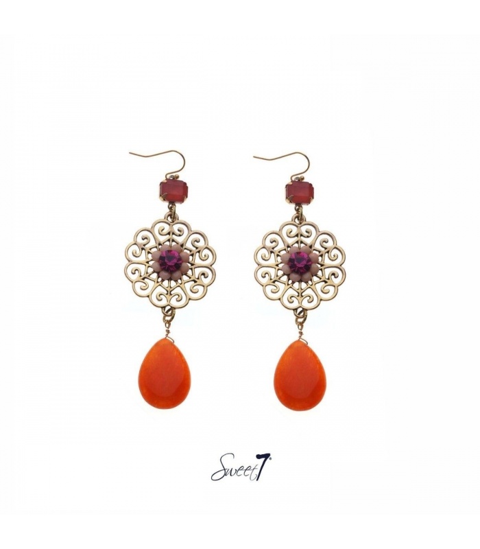 Goudkleurige oorhangers met roze steentjes in bloemvorm en een oranje hanger.