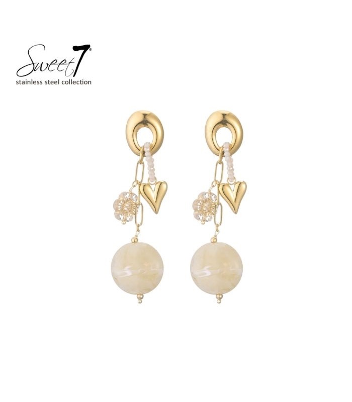 Wil je een oorbel die romantiek en klasse uitstraalt? Deze oorbellen combineren een goudkleurige schakel met een harten bedel en subtiele kralen. De grote marmerlook kraal geeft body en beweging. Perfect als stainless steel oorbellen voor een elegante, trendy look.