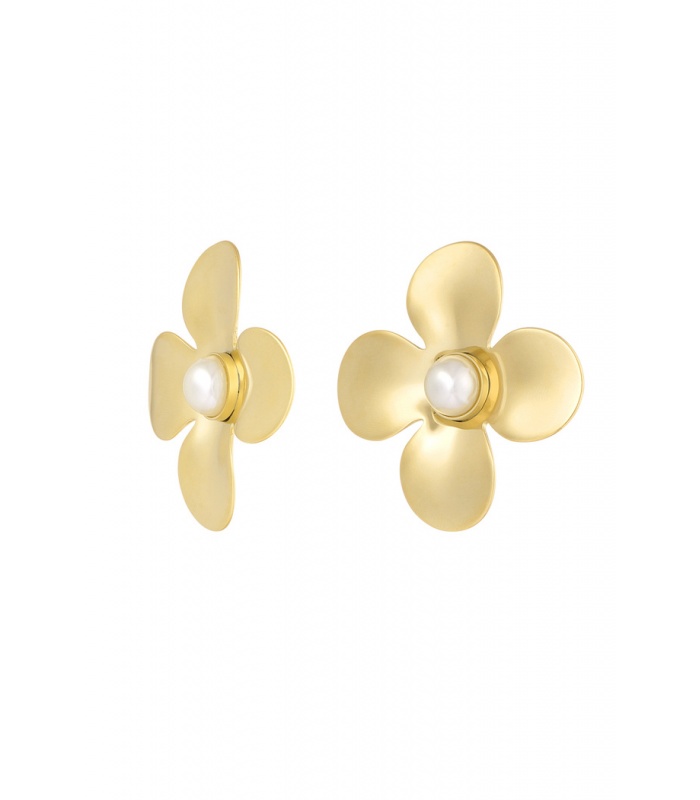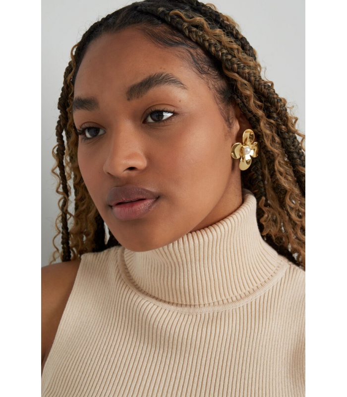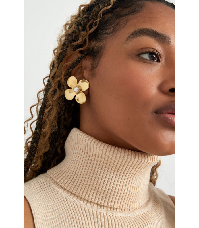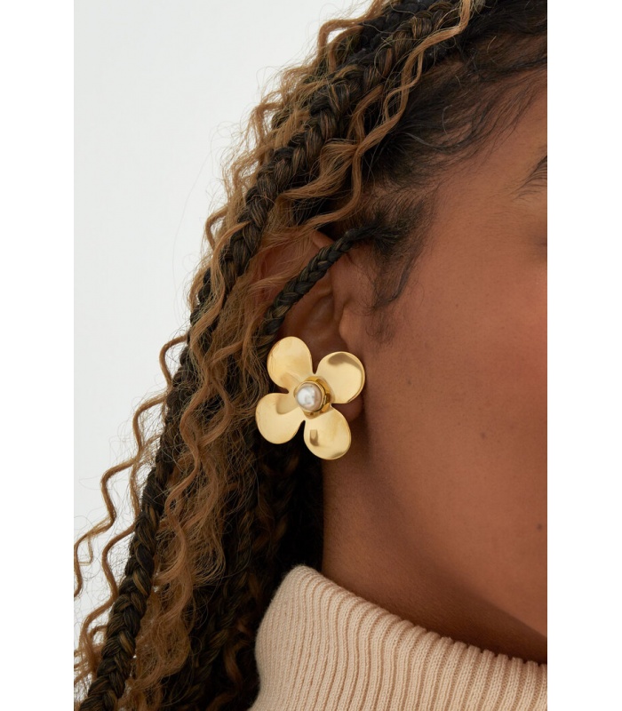 Deze prachtige goudkleurige bloemen oor stekers voegen een vleugje verfijning toe aan elke outfit. De subtiele glans van de gouden bloembladen in combinatie met een elegante imitatieparel zorgt voor een tijdloze look.