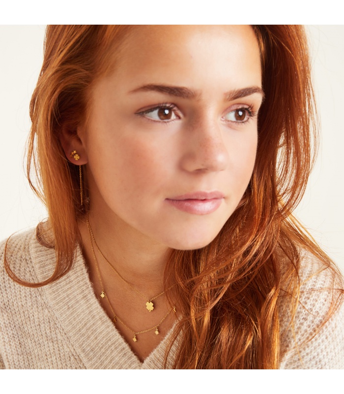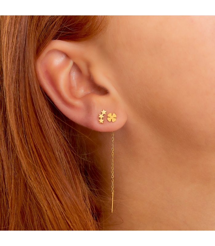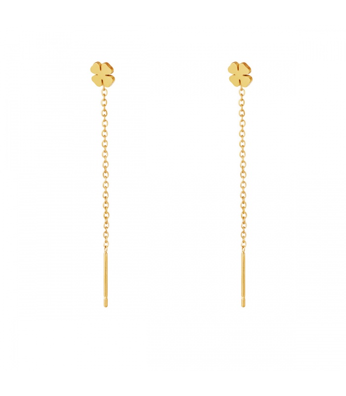 Goudkleurige hangende ketting oorbellen met een klaver bedel.