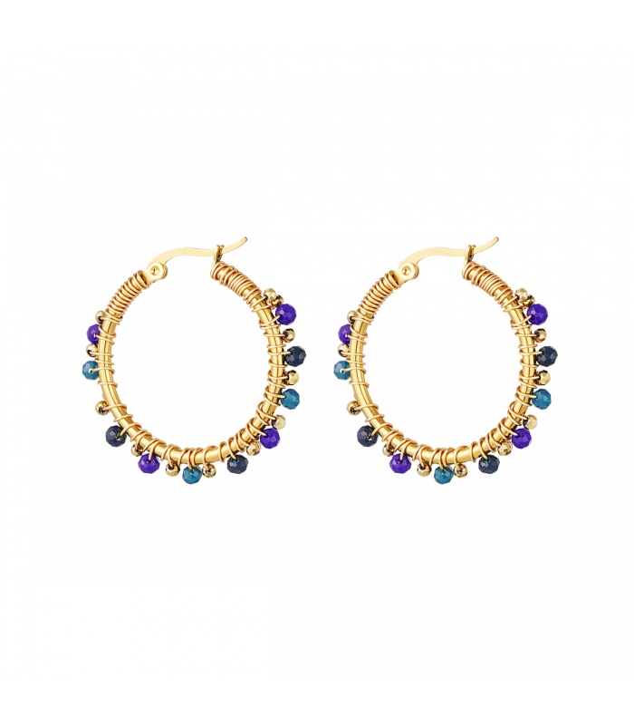 Goudkleurige hoops met blauwe kralen.